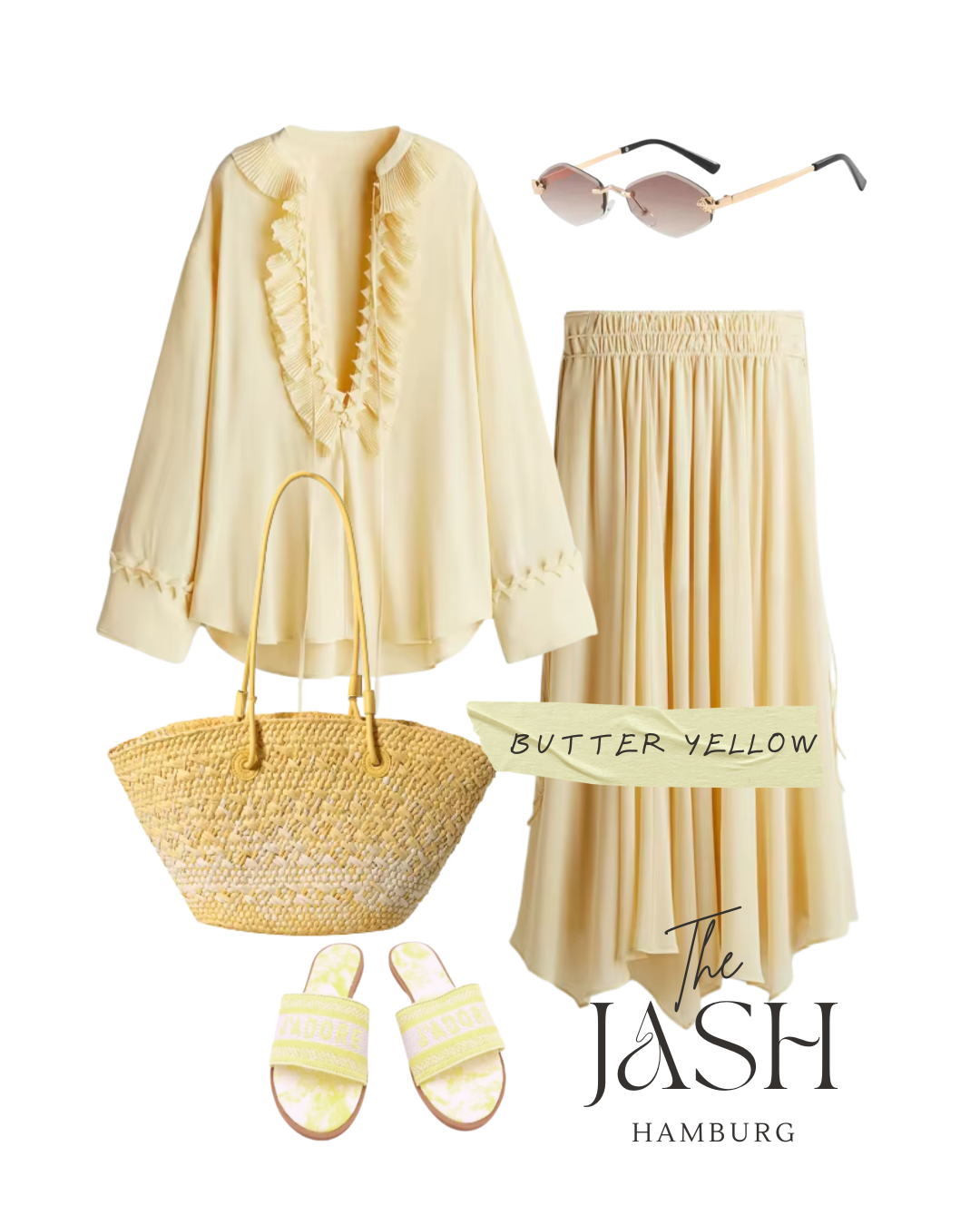 Entdecke den viralen Sommerlook in der Trendfarbe Butter Yellow: eine Boho Rüschenbluse mit V-Ausschnitt, ein luftiger Maxirock, stylische Pantoletten, eine angesagte Strohtasche und eine moderne Sonnenbrille. Perfekt für Strand, Urlaub, Beach Club und Social Media Shootings. Das Influencer-Set kombiniert Leichtigkeit, femininen Chic und maximalen Komfort – ideal für Saint Tropez, Capri & Côte d’Azur Vibes. Dein Must-have für Sommer 2025!