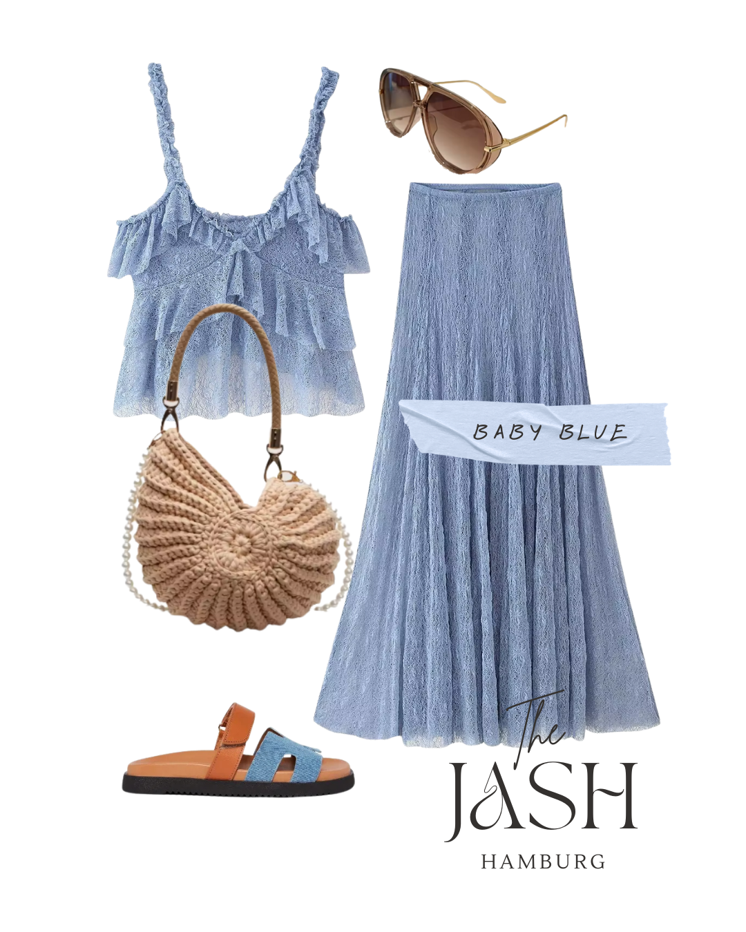 Entdecke den perfekten Sommer-Look: ein zartes Spitzentop mit Volant-Rüschen kombiniert mit einem fließenden Maxirock für feminine Boho-Vibes. Dazu angesagte Pantoletten und eine stylische Muscheltasche in Häkeloptik mit Perlendetails – das Must-have-Accessoire für Strand, Beachclub oder City. Dieses Trend-Outfit ist inspiriert vom aktuellen Influencer-Style und sorgt für maximale Aufmerksamkeit. Ideal für Urlaub, Festival oder sommerliche Events. Dein neuer Lieblingslook für 2025!