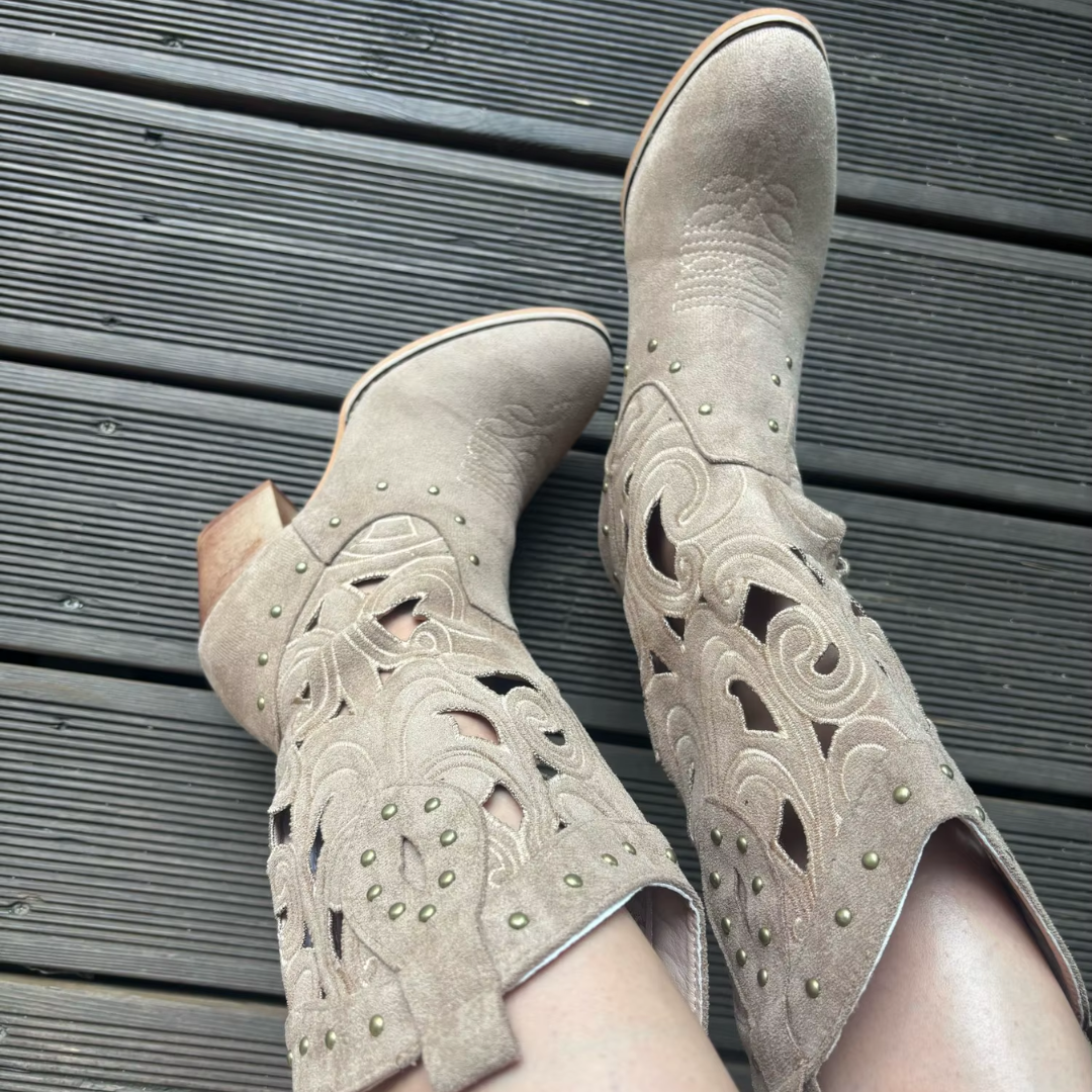 Cowboy Stiefel bestickt – Toffee & Beige | Western Boots mit Lochmuster | Slip-On