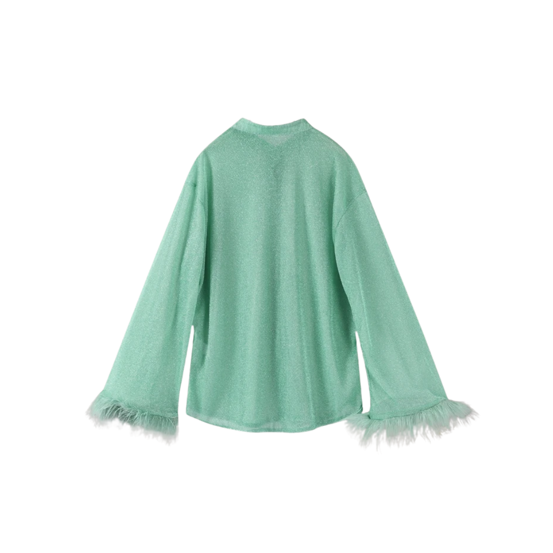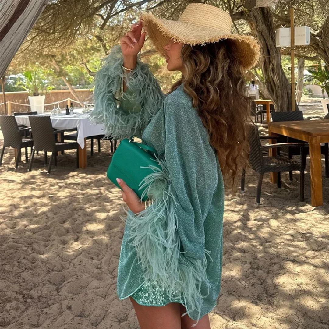 GLAM Glitzerbluse mit Federn – Türkis | Sequin Feather Look | Glam Beach Club & Party Outfit