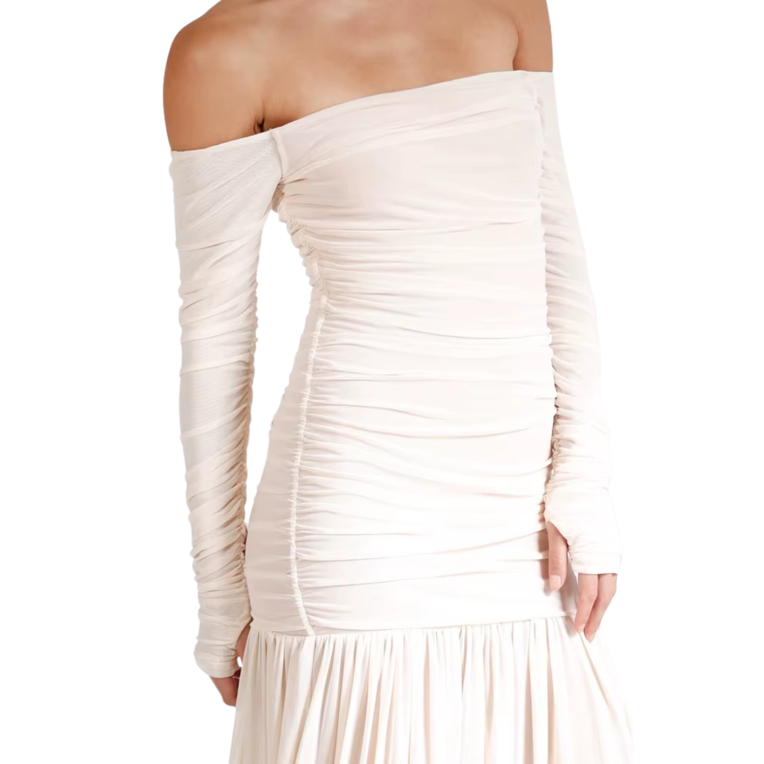 Erhältlich in den traumhaften Trendfarben Powder Blue und Creme passt sich dieses Pastellkleid jedem Hautton an und bringt deine Silhouette wunderschön zur Geltung. Die langen Ärmel im Off-Shoulder-Schnitt unterstreichen den eleganten Look und machen das Kleid zu einem wahren Eyecatcher im Influencer Style.