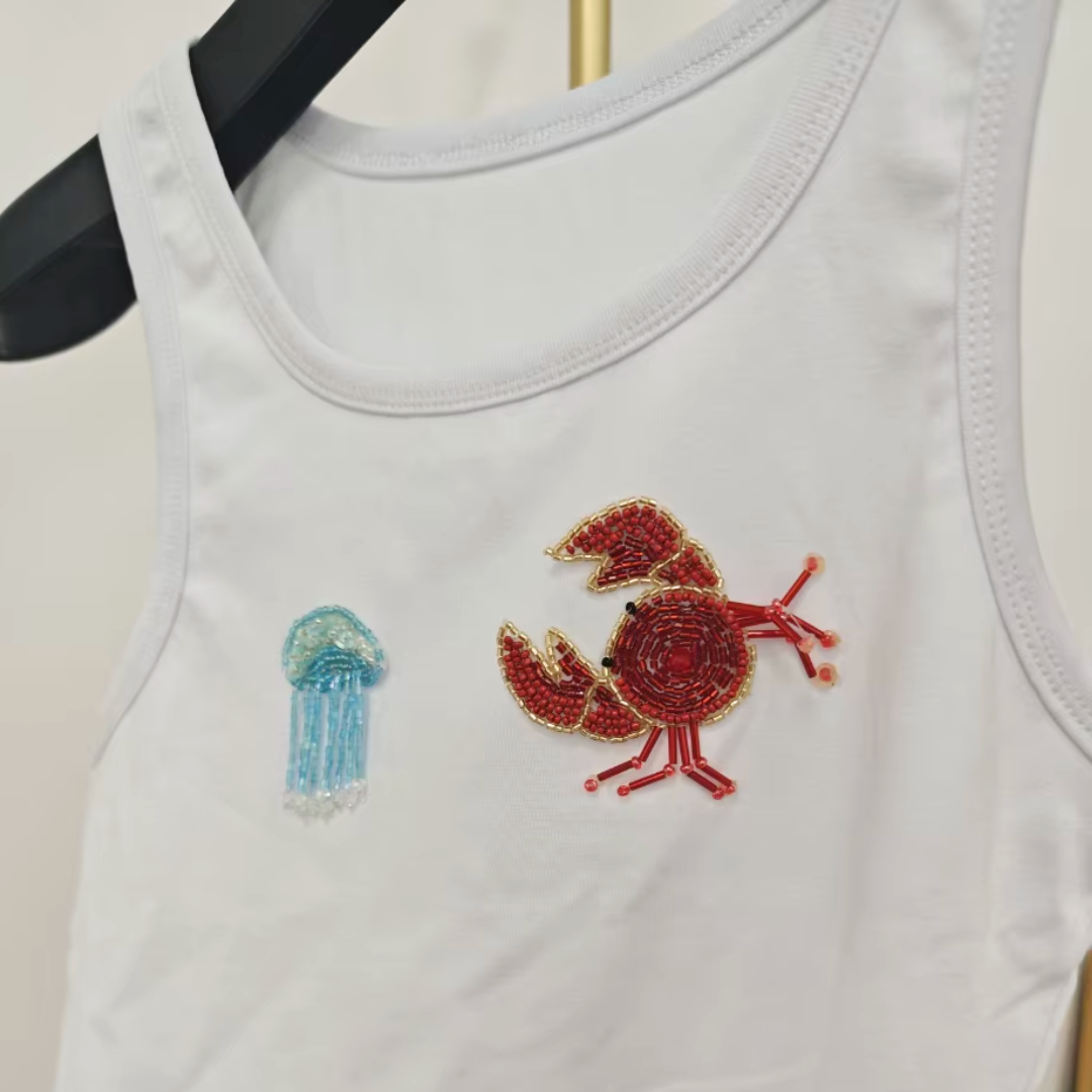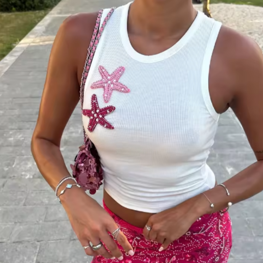 Tauche ein in den Mermaid-Trend 2025 mit unserem exklusiven Tanktop mit handbestickter Seestern- oder Krabben-Applikation – das perfekte Beach Club Outfit für heiße Sommertage! Die glitzernden Perlen-Details in zarten Rosa- und Pinktönen bringen Sommer-Vibes, Influencer-Style und maritimen Charme in jedes Outfit. Egal ob am Meer, beim City-Trip oder auf dem Festival – dieses Top ist ein echter Eyecatcher.