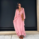 Dieses Maxikleid in Rosa ist dein perfekter Begleiter für den Sommerurlaub, Strandspaziergänge oder elegante Events. Der Boho Look mit romantischen Volants, V-Ausschnitt und langen Ärmeln macht es zum It-Piece für Hochzeitsgäste, Fashionistas und alle, die den Influencer Style lieben.