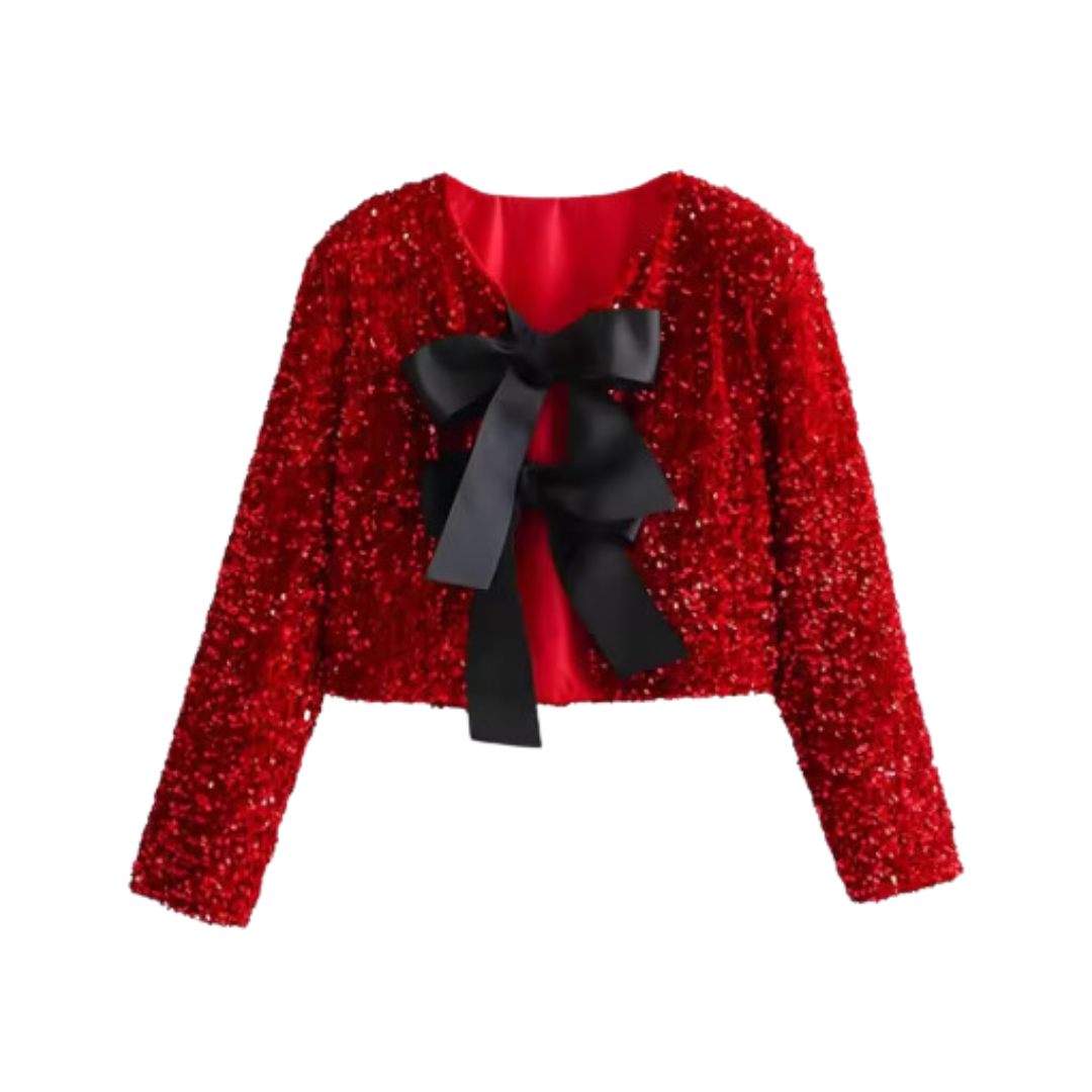Glamour pur: Deine kurze Paillettenjacke mit Schleifenverschluss