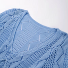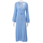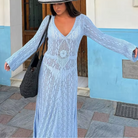 Unser HEAVEN Häkelkleid in hellblau vereint romantische Eleganz mit sommerlichem Flair und ist ein absolutes Must-have für deinen Urlaub. Mit seinem V-Ausschnitt, den filigranen Blumenapplikationen und der luftigen Häkeloptik ist es ideal als Strickkleid-Cover-up für den Strand oder als stylisches Highlight für warme Tage.