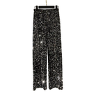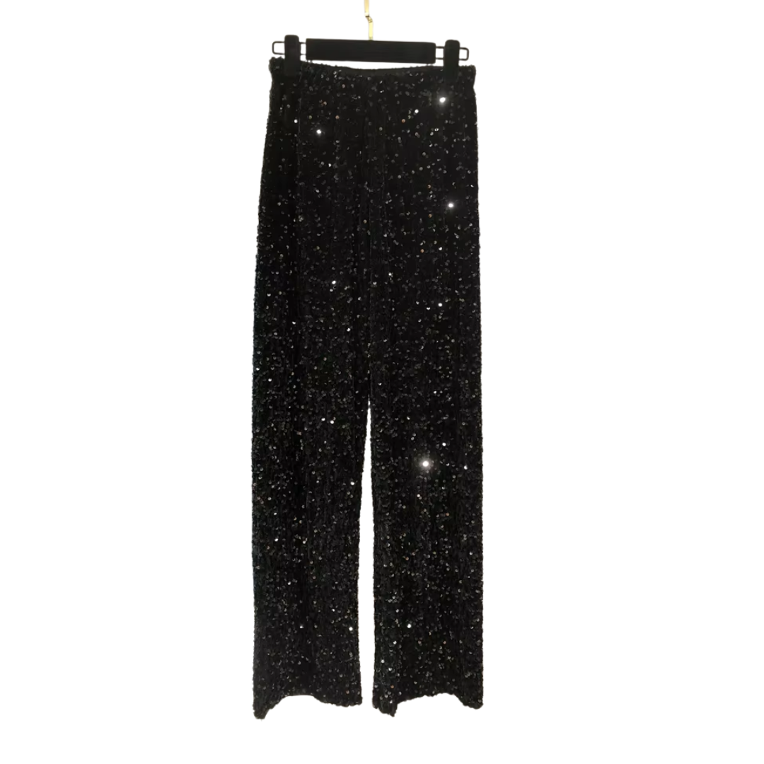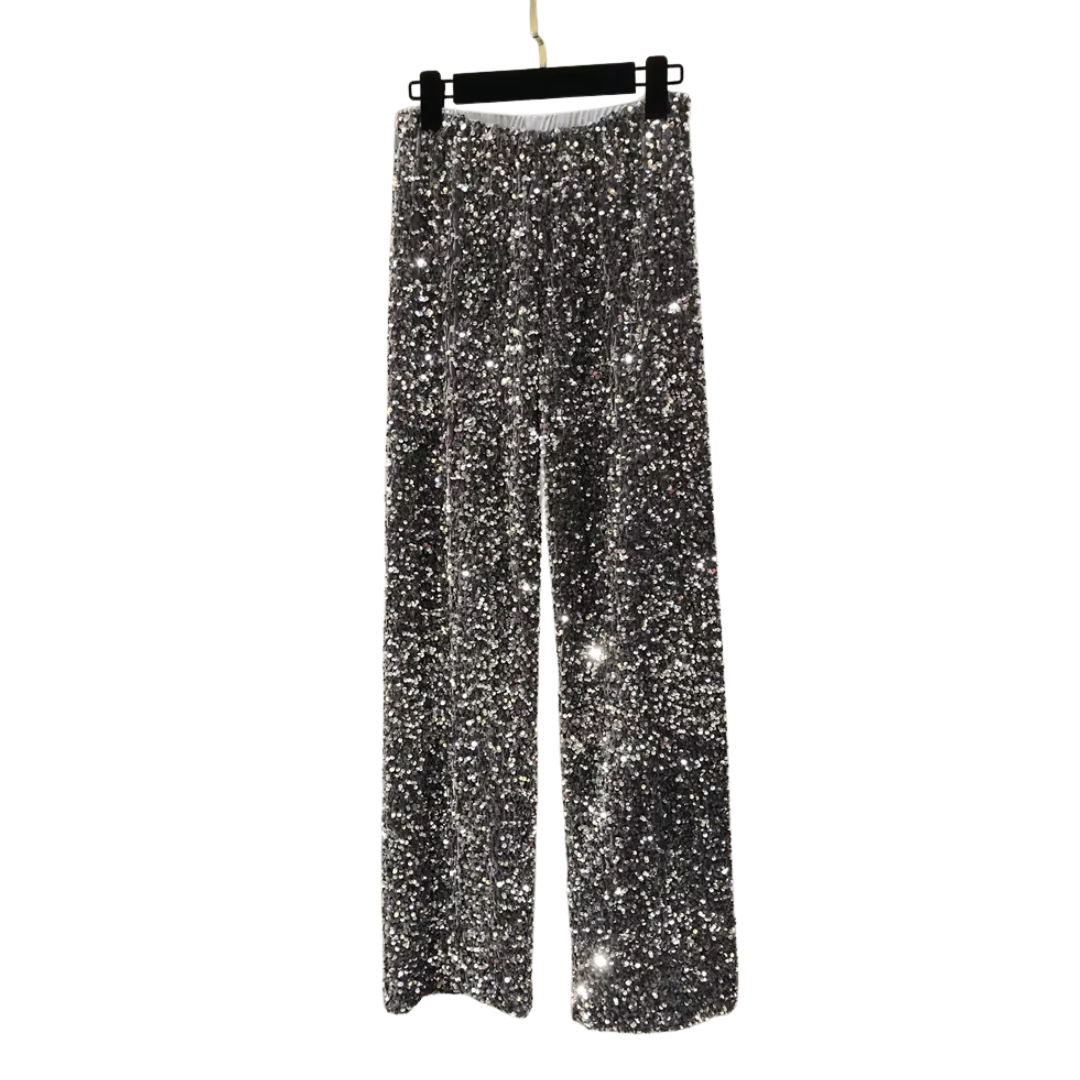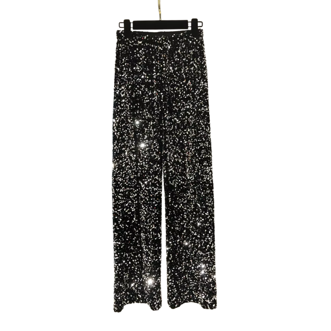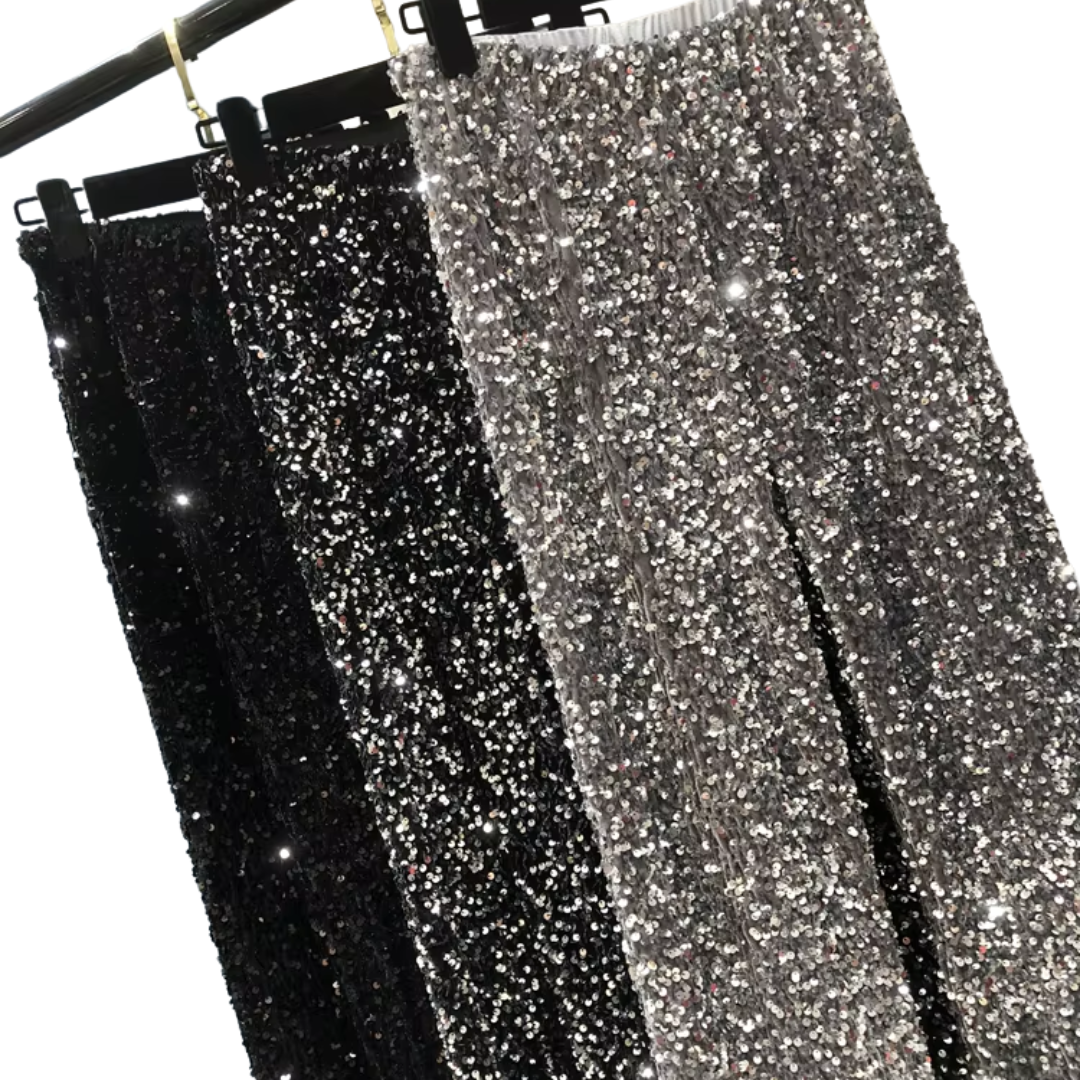 Diese elegante Paillettenhose aus Polyester mit Stretch sorgt für maximalen Glamour und hohen Tragekomfort. Erhältlich in Schwarz, Silber und Grau, überzeugt sie mit einem weiten Bein und einem edlen, funkelnden Look – perfekt für Partys, Events oder besondere Abende.