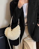 Diese angesagte Häkeltasche in Muschelform ist das perfekte Accessoire für deinen Sommerurlaub, Beachclub-Look oder lässigen Boho-Style. Mit edlen Perlendetails und einem abnehmbaren Trageriemen kombiniert sie Funktionalität mit stylischem Design. Erhältlich in 5 Trendfarben, passt sie zu jedem Influencer-Outfit und sorgt für virale Outfit-Inspo. Die Muschel-Häkeloptik macht sie zum Eyecatcher für Strand, City oder Festival.